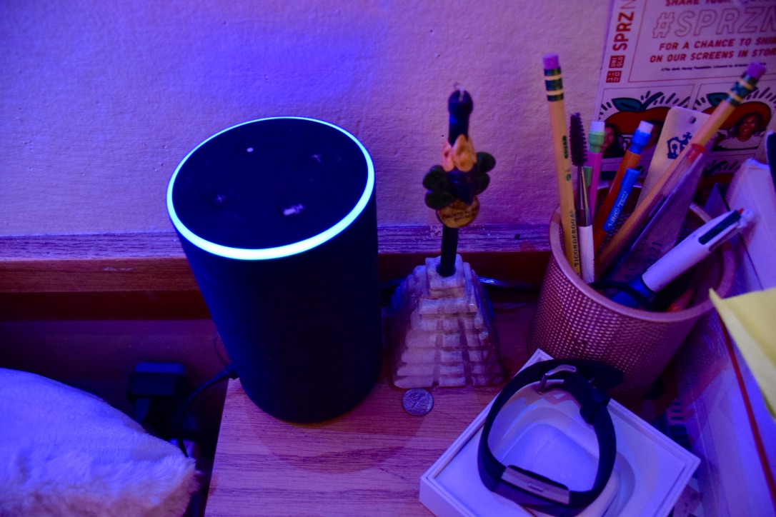 A: I use Alexa every day to get the weather, help with homework, or to play music and relax. As for room decorations, I have lights all around my room to set a serene environment. I also have a television to watch TV when I have free time.