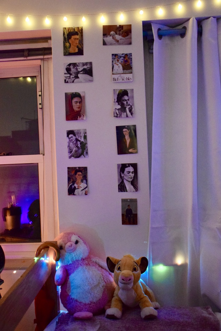 A: Everything on that shelf, like all those decorations, I got from Mexico City. I went there this summer to do research, and during my time there I got a lot of pieces. Like the painting is from one of my favorite artists, Frida Kahlo, and then I also have a very famous mural by Diego Rivera. And there are a lot handcrafted, artisanal things that I gather from my summer trips.